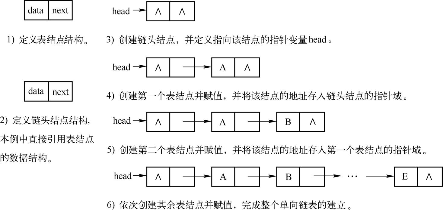 建立单向链表的运算过程如下:定义表结点结构,定义链头结点结构,声明链头结点指针变量;创建第一个表结点并赋值,将第一个表结点的地址赋给链头结点的指针域;创建第二个结点并赋值,将第二个表结点的地址赋给第一个表结点的指针域;依次类推,完成单向链表所有表结点的建立。