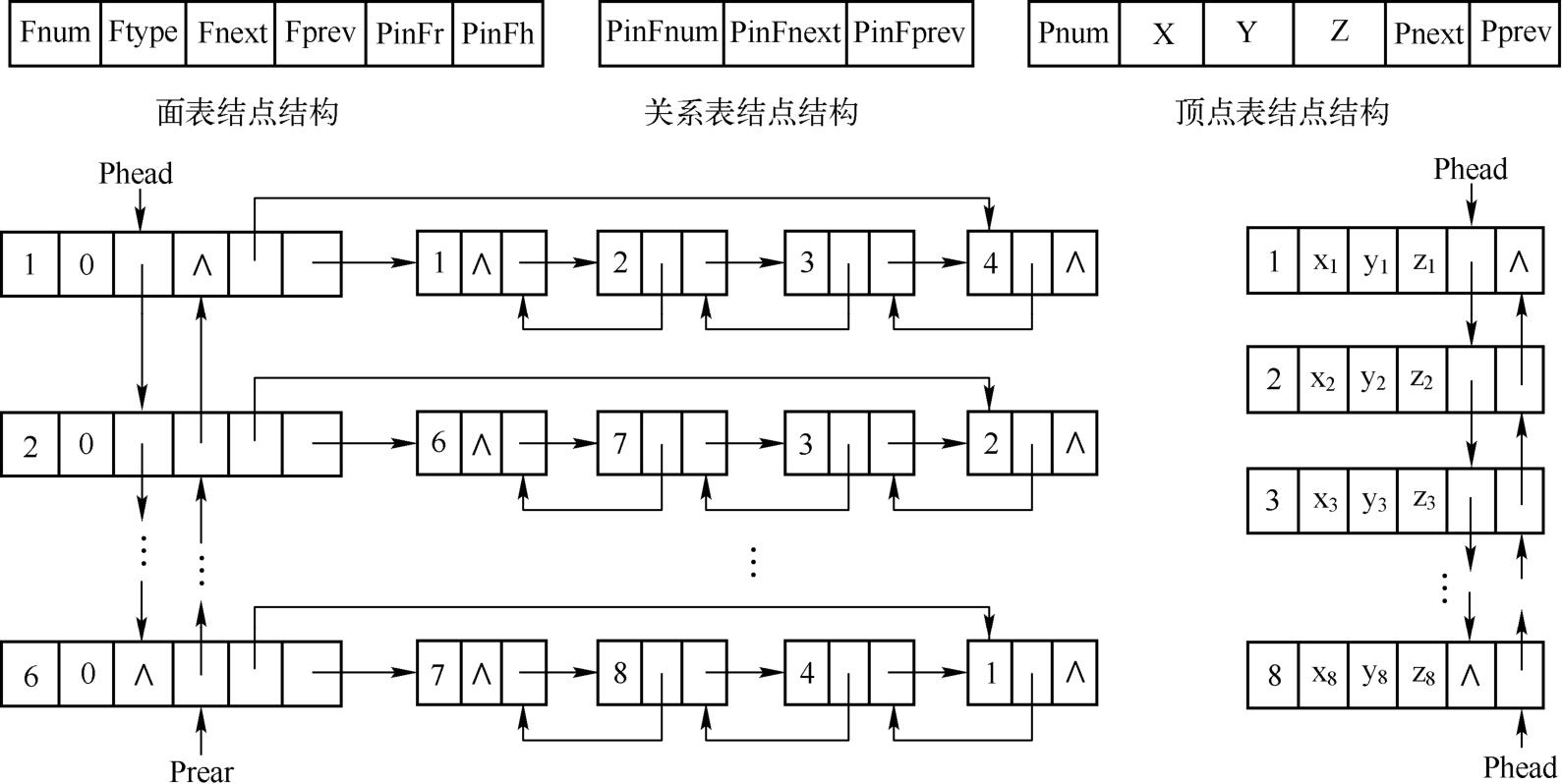 在忽略形体隐藏性的情况下,用于存储长方体(如图3-11所示)的三链表数据结构如图3-12所示。其中,面表的首尾结点的指针分别为Fhead和Frear,顶点表的首尾结点的指针分别为Phead和Prear。
