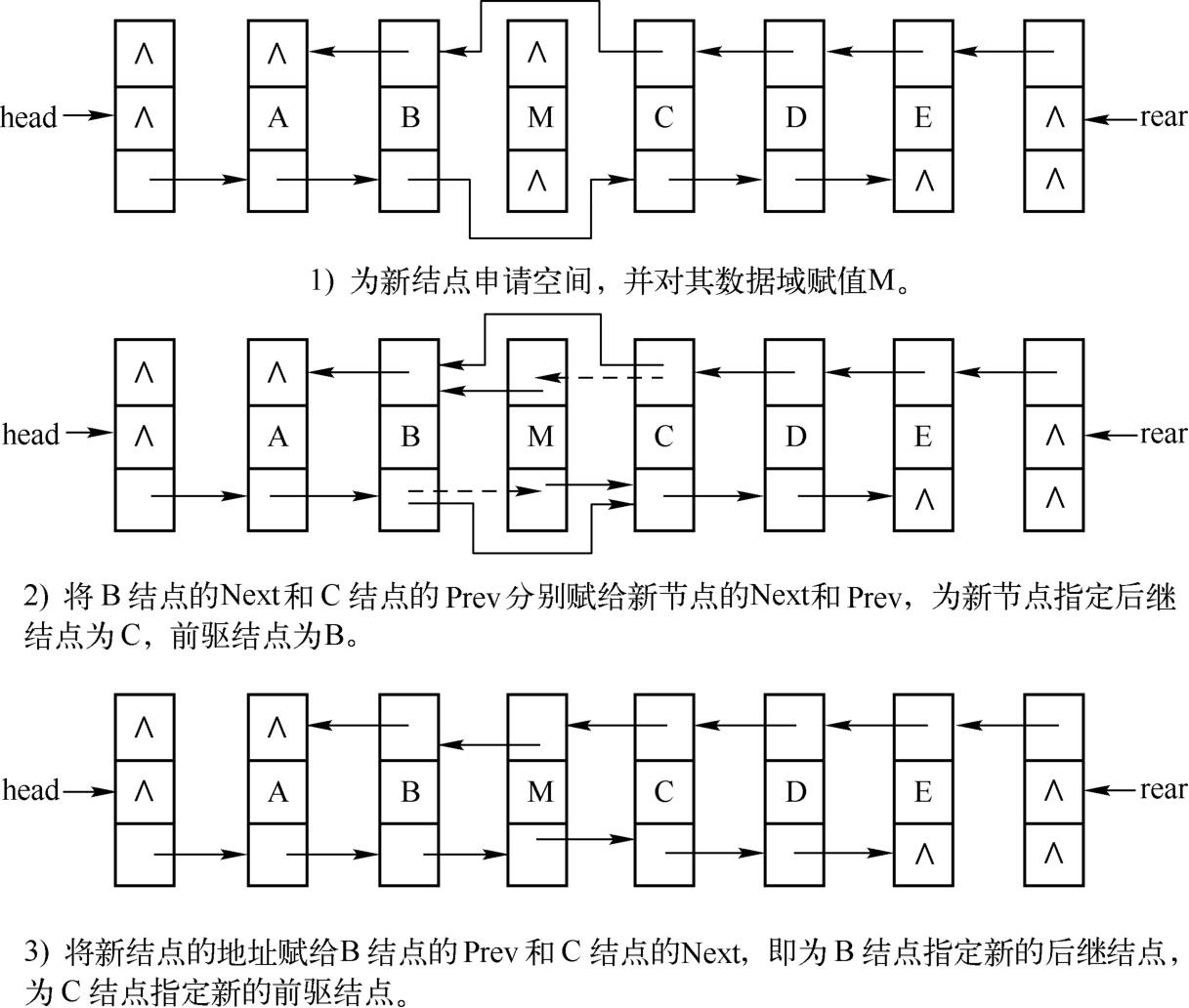 若要在第i个数据元素之前插入一个新的数据元素,首先,为该元素申请存储空间,得到一个新结点,这个新结点的数据域存放该元素的值;其次,找到第i-1个和第i个结点,新结点的指针域Next存放第i-1个结点的指针域Next的内容,指针域Prev存放第i个结点指针域Prev的内容,结点i-1的指针域和结点i指针域存放新结点的地址。在第三个数据元素之前插入新数据元素的过程如图3-10所示。