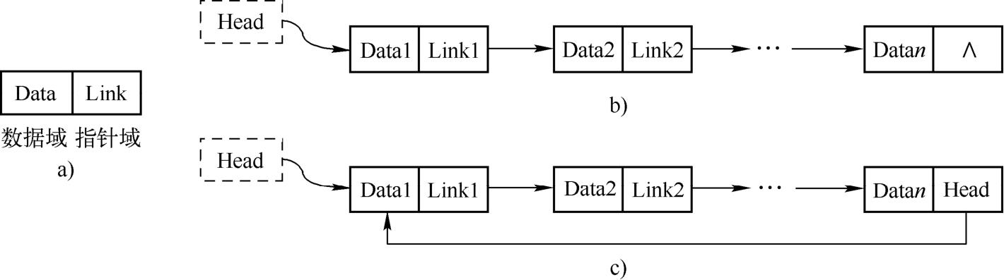 a) 表结点 b) 单向链表 c) 单向循环链表