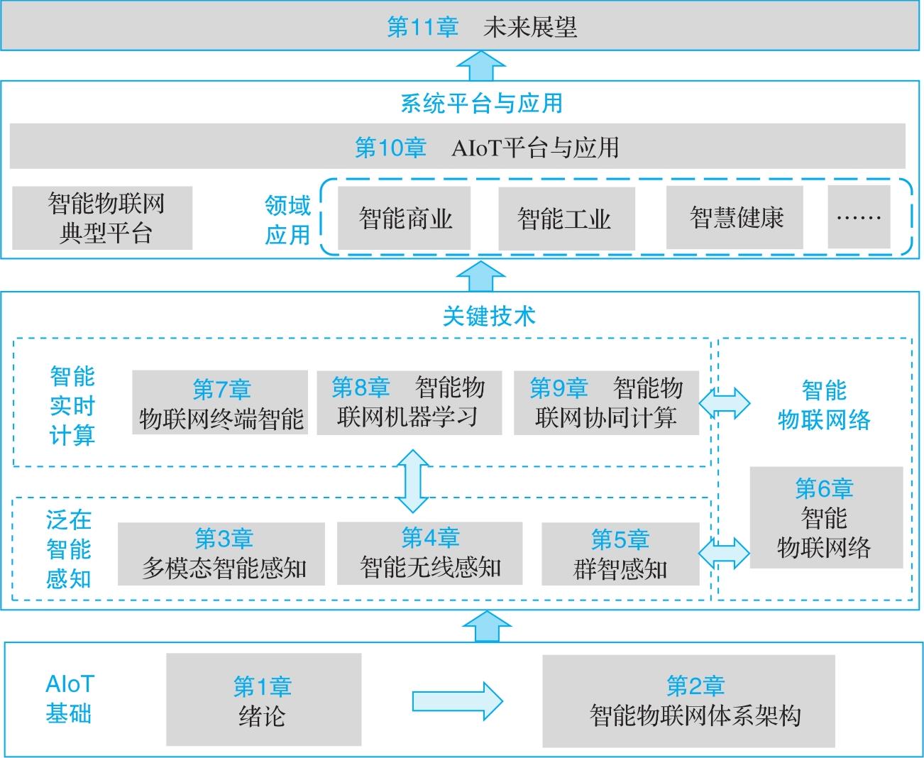 本书从AIoT新型体系架构出发,按照“智能感知-网络增强-协同计算-平台应用”的组织思路,遵循“创新引领、深入浅出、理论+实践”的原则基调,就智能物联网的基本概念、体系架构、智能感知、群智感知、智能物联网络、终端适配智能计算、分布式学习、端边云协同计算、平台及典型应用等进行系统性阐述和深入探讨。全书共分11章,整体结构如图1-8所示,各章内容概述如下。