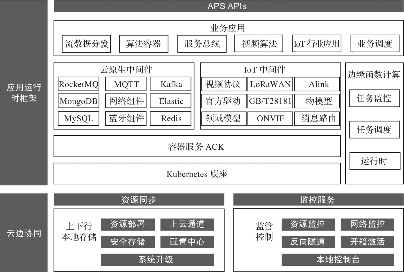 应用运行时框架包含业务应用、云原生中间件、IoT中间件、边缘函数计算、容器服务ACK等多个功能模块。应用运行时分为二进制运行时和容器运行时。