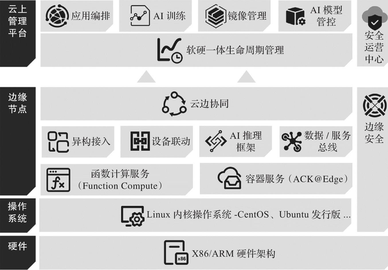 边缘端架构是运行于边缘服务器中的软件框架,支持容器运行时和二进制运行时。功能模块可按需拼装,适用于各种不同规格的硬件产品量产预装。整体架构如图2-18所示。