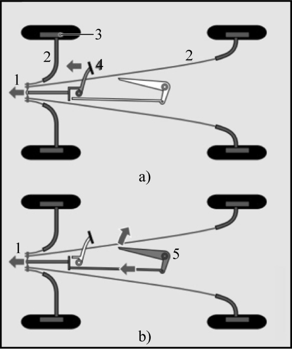 1—制动压力通路 2—制动拉索 3—车轮制动 4—制动脚踏板 5—驻车制动拉杆