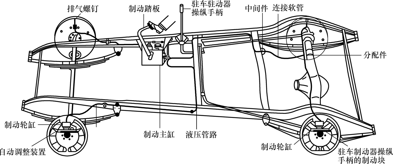 1919年,当马尔科姆·洛克希德将一种由液压作动的制动系统引入汽车后,机械传动所导致的制动力不均匀问题得以解决。洛克希德系统通过作用在制动踏板上的压力把制动液由活塞从制动主缸压出并通过管路和软管进入制动轮缸,该系统中的核心组成部件至今仍在使用,图2.17为早期采用的液压制动系统结构组成图。在这套系统当中,驾驶员的体力以液压的形式在封闭制动管中传递。这种结构的优点是显著地降低车辙斜拉的危险。另外,机械式制动器的效率为0.4~0.5,液压制动器的效率为0.8~0.9。