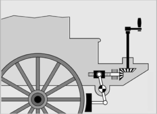 制动的历史比火车和汽车的历史要更加悠久,最早可追溯到轮子的出现。在汽车出现之前,马车等畜力车一度成为人们使用最为广泛的陆上交通工具。一般来讲,行驶在平直道或者上坡路段的马车通过驭手手中的辔绳即可掌控马车的行驶状态,无需配备专门的制动装置。所以《诗经·秦风·小戎》写到“四牡孔阜,六辔在手”。但行驶在下坡路段特别是坡度比较陡、比较长的时候,为了控制车速以及防止车厢撞到马后部,马车出现了简单的制动装置。1690年开始,四轮马车在下坡过程中通过控制把手将木质的楔块压向滚动的车轮进行制动减速,这是闸瓦制动的雏形。经过不断地改进与发展,到1850年的时候,一种驾驶员可操控的带有曲柄把手和齿轮传动辅助的闸瓦制动出现了,其结构原理图如图2.12所示。由于马车的速度有限,通过手或脚操纵杠杆、链条和拉索的闸瓦、皮带和楔块制动就足以满足当时马车的制动需求。