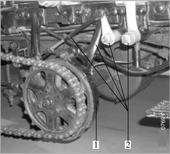 为解决橡胶轮胎汽车的制动问题,卡尔·本茨采用了一种新式的与马车制动装置有所不同的结构形式。它的制动器是安装在刚性的后驱动桥上,并采用皮革作为摩擦材料。为提高制动器的使用寿命,以钢材或铸铁替代皮革作为摩擦材料的带式制动或车轴闸瓦制动,以及后期出现的传动轴闸瓦制动,成为汽车的主流制动方式。图2.13~图2.15为早期汽车上使用的人力机械制动装置。