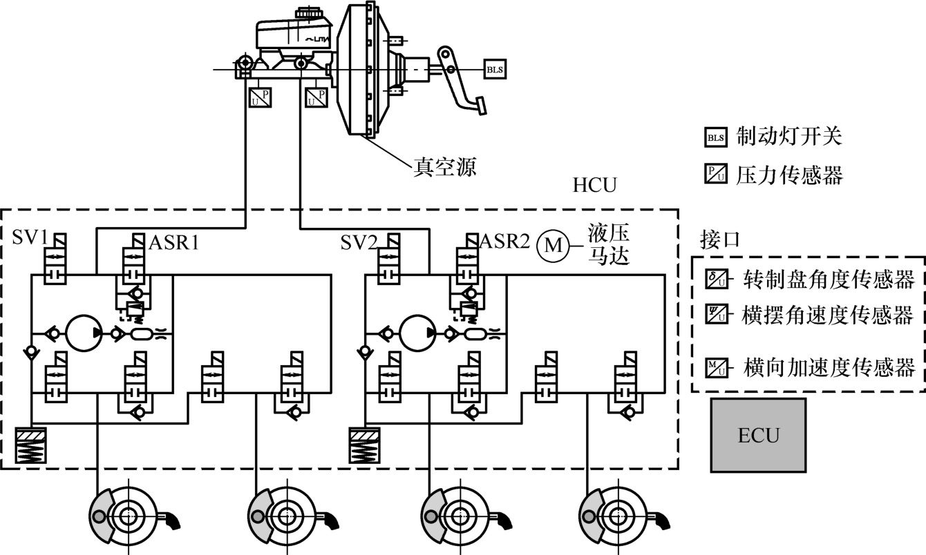 SV1/SV2—进液阀 ASR1/ASR2—排液阀 HCU—液压控制单元 ECU—电子控制单元