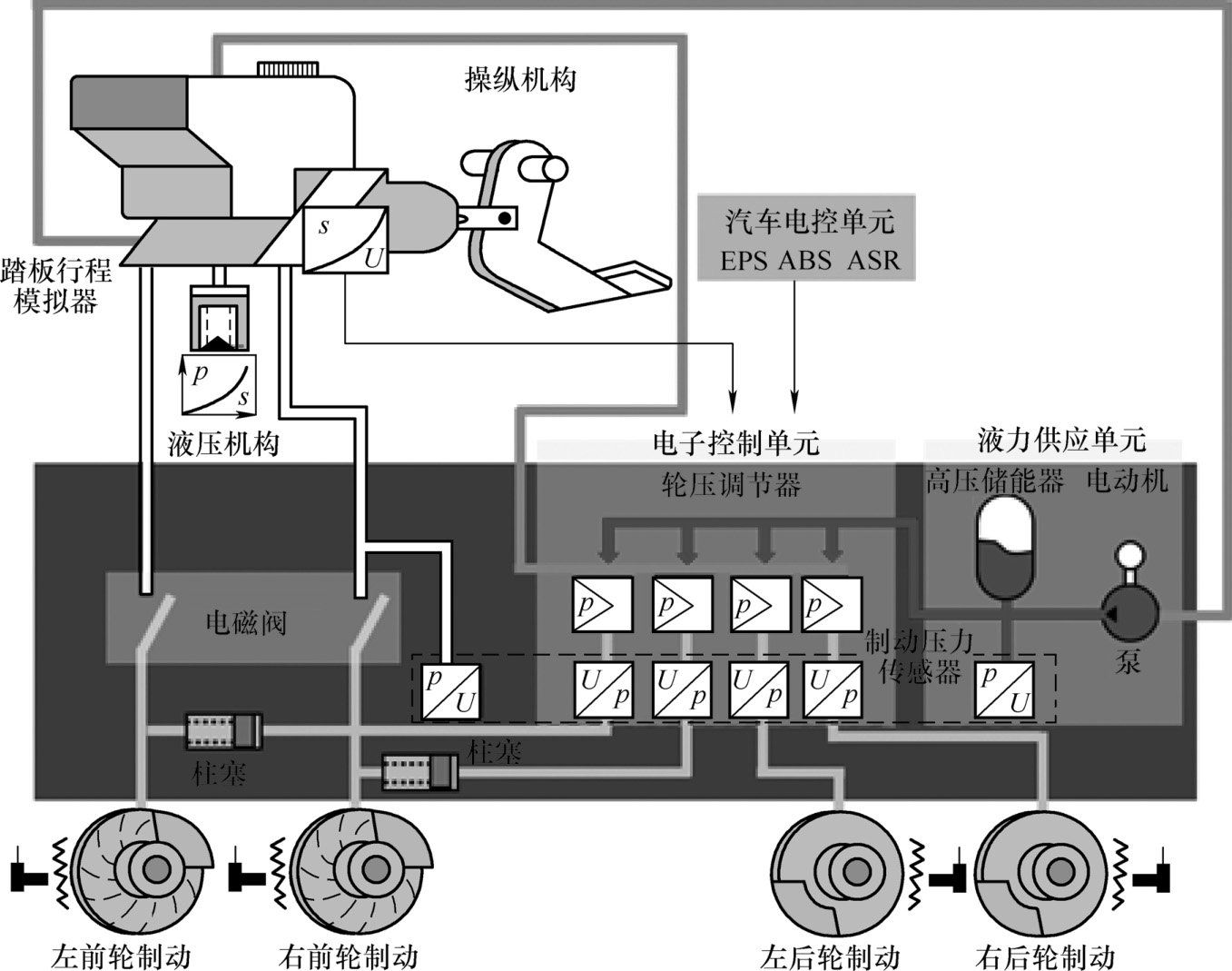 6)EHB系统。安全、节能、环保、舒适是汽车发展的永恒主题。20世纪70年代以后,石油危机的出现使得电动汽车再一次得到重视。1997年,丰田汽车率先开始量产混合动力汽车普锐斯,标志着汽车电动化开始到来。1983年出现的CAN网络通信平台和2003年出现的汽车开放性系统架构AUTOSAR,加速了汽车电控系统的网络化,从而加快实现汽车驾驶的全自动化。汽车电动化和智能化的发展推动了制动系统朝着线控制动方向发展。线控制动采用电线连接取代制动踏板与制动器之间的机械连接,通过检测制动踏板的行程及压力,对制动踏板的状态及独立的各车轮制动力进行电气管理。从功能上看,电动汽车要实现制动能量回收,制动系统须由电机回馈制动和另一种制动方式共同作用。由于电机制动的特性以及回收能量最大化的需求,液压制动系统的制动力必须实时可调,因此线控制动是必然的发展方向。