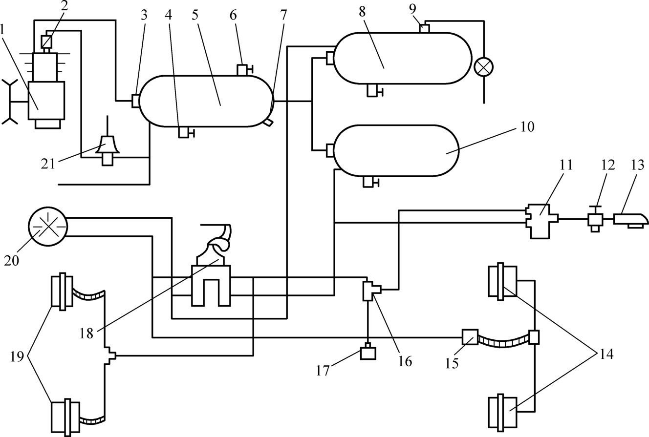 1—空气压缩机 2—卸荷阀 3—单向阀 4—放水阀 5—湿储气筒 6—取气阀 7—安全阀 8—后桥储筒 9—气压过低报警开关 10—前桥储气筒 11—挂车制动控制阀 12—分离阀 13—连接头 14—后轮制动气室 15—快放阀 16—双通单向阀 17—制动灯开关 18—制动控制阀 19—前轮制动气室 20—气压表 21—调压阀