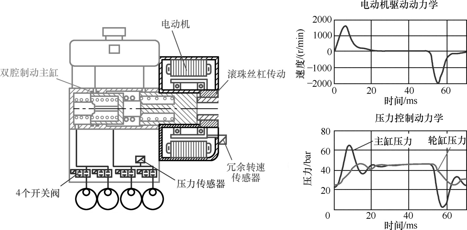 2012年,LSP公司的Heinz Leiber和Thomas Leiber推出最新的IBS系统,其结构原理及动态曲线如图2.24所示。它主要由空心电动机、滚珠丝杠、主缸、液压控制单元等组成,是一种电动助力与电液制动的结合体。空心电动机和滚珠丝杠组成助力机构,通过控制电动机输出转矩大小进行助力控制,进而得到一个良好的踏板感觉。与其他液压控制单元不同,IBS的液压调节单元只有4个电磁阀,且没有节流口,主要根据系统PV特性,通过助力机构推动活塞前进或后退来控制轮缸压力。因此,电动机的响应速度直接决定了轮缸的建压速度。该系统也具有失效备份功能。