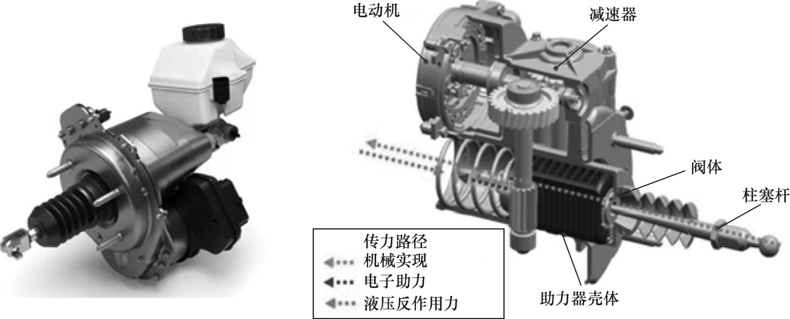 iBooster由永磁同步电动机、蜗轮蜗杆、齿轮齿条、踏板行程传感器等组成,工作原理与传统真空助力器的工作原理基本一致,通过踏板推杆与助力阀体在反应盘处耦合原理来控制助力大小,其结构原理见图2.25。当驾驶员踩下制动踏板时,踏板位移传感器会把位移信息传给电子控制单元,电子控制单元经过内部计算后,会输出合适的控制信号,来控制电动机驱动单元,进而控制电动机产生合适的转矩值,再经过蜗轮蜗杆和齿轮齿条减速机构把电动机的转矩转变成阀体的推力,这样输入推杆和阀体一起作用在反应盘上,推动主缸顶杆向前运动,从而建立制动压力。此外,iBooster能够实现可变助力比,可以满足不同类型客户的差异化需求。iBooster与ESP阀块协作,可以回收0.3 g 减速度以内的制动能量,涵盖了大部分的制动工况,这对于提高电动车的续驶里程有很高的价值。iBooster也可以作为自动紧急制动、自适应巡航控制等辅助驾驶功能的执行器。遇到紧急情况,需要车辆进行主动制动时,iBooster能在150ms内从建压达到车轮抱死状态,响应非常迅速,可以大大减少事故的发生率,保证驾驶员的财产和生命安全。