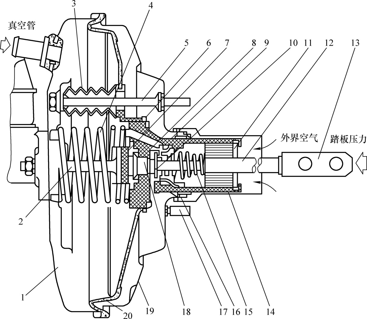 1—伺服气室前壳体 2—制动主缸推杆 3—导向螺栓密封套 4—膜片回位弹簧 5—导向螺栓 6—控制阀 7—橡胶反作用盘 8—伺服气室膜片座 9—橡胶阀门 10—大气阀座 11—过滤环 12—控制阀推杆 13—调整叉 14—毛毡过滤环 15—控制阀推杆弹簧 16—阀门弹簧 17—螺栓 18—控制阀柱塞 19—伺服气室后壳体 20—伺服气室膜片