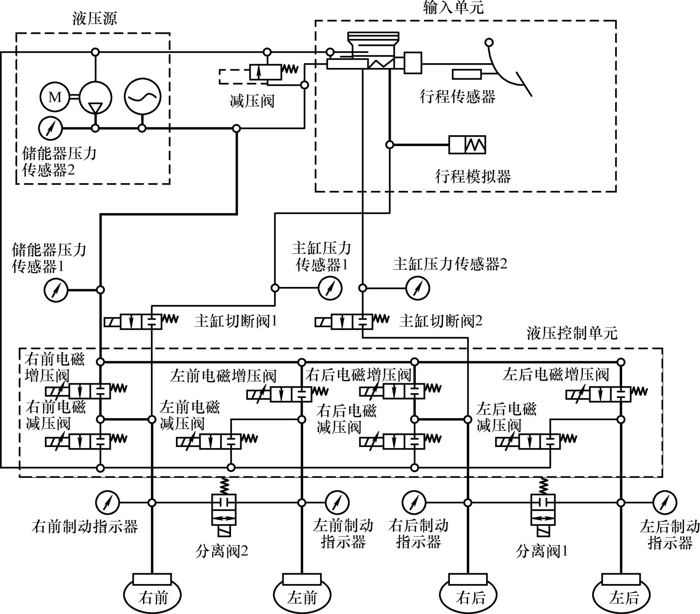 ECB系统原理如图2.23所示,它主要由踏板感觉模拟器、高压源、液压控制单元等组成,是一种典型的线控制动系统。正常模式下,踏板感觉模拟器一方面负责提供良好的制动踏板感,另一方面采集驾驶员的制动意图,液压控制单元则根据驾驶员的制动意图控制电磁阀的开关来进行轮缸压力控制。当EHB系统失效时,备用系统开始作用,电控单元将切换成应急控制模式,制动踏板力的液压管路与应急制动管路连通,踏板力直接通过液压管理加载在制动器上。因此,EHB系统是一个完全解耦的电液制动系统,能十分方便地与再生制动配合工作,在进行能量回收的同时保证良好的踏板感觉。在高压源失效的情况下,人力也可以提供一定的制动力,有失效备份的功能。