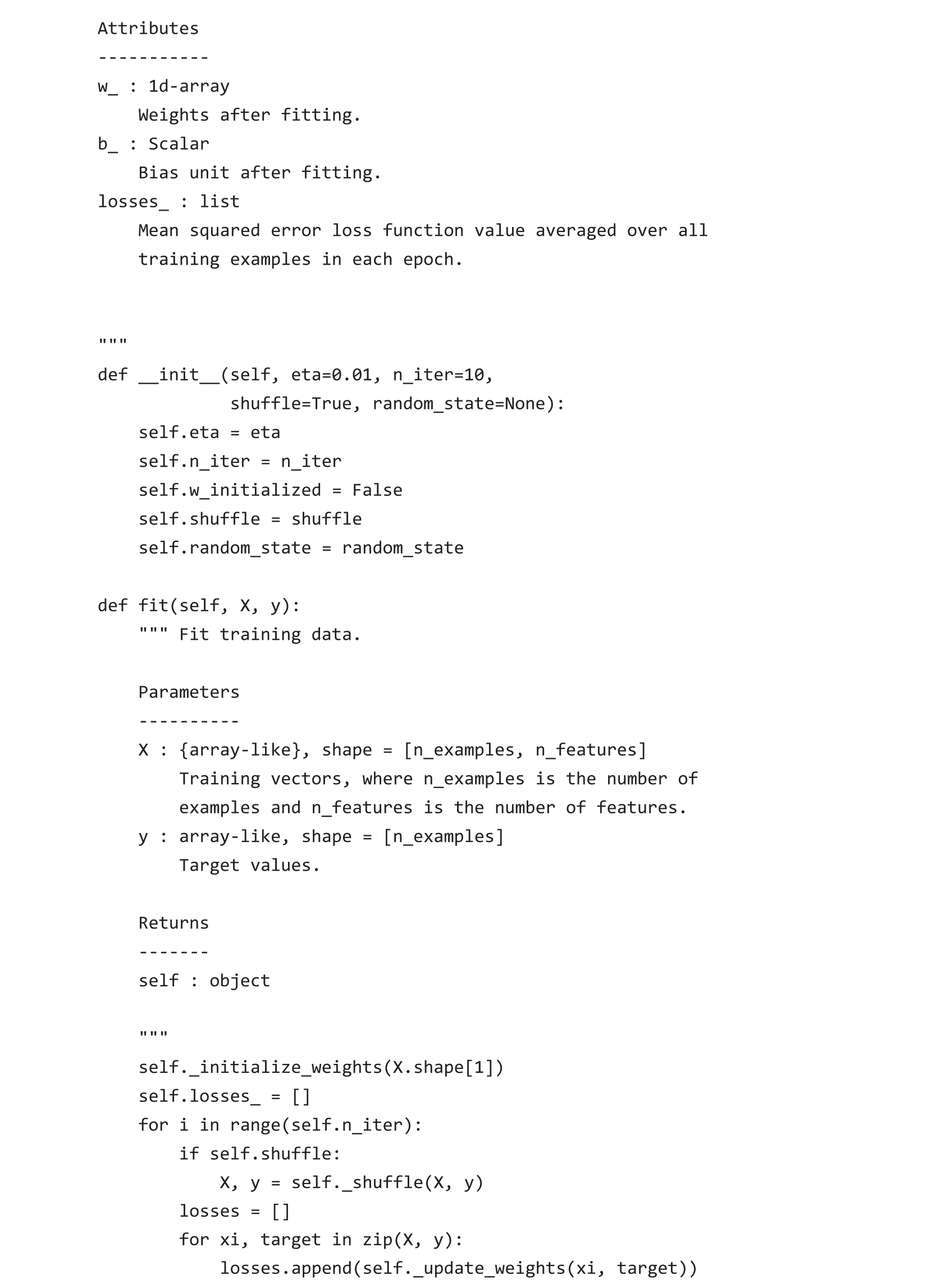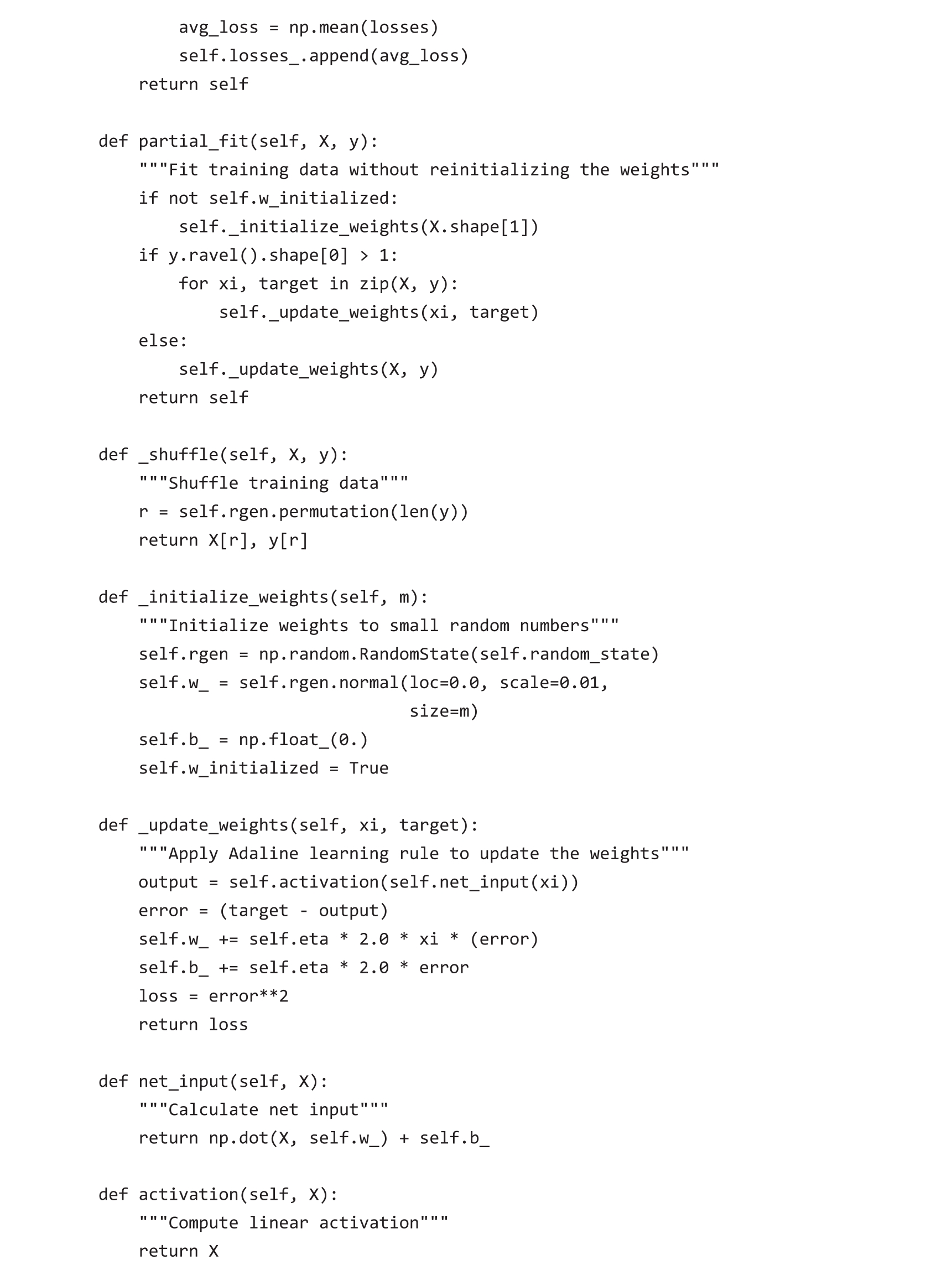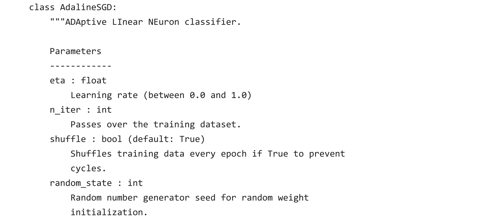 由于已经使用梯度下降实现了Adaline学习规则,因此只需要对代码做一些调整让其使用随机梯度下降更新权重。在fit方法中,使用每个训练样本更新权重。此外,为了实现在线学习,增加了partial_fit方法,该方法不重新初始化权重。为了检查算法在训练后是否收敛,在每次epoch后计算所有训练样本的平均损失函数值。此外,在每次epoch开始之前,对训练数据进行乱序,以避免优化损失函数时每次epoch重复循环。通过random_state参数,允许使用随机种子来确保实验可复现。