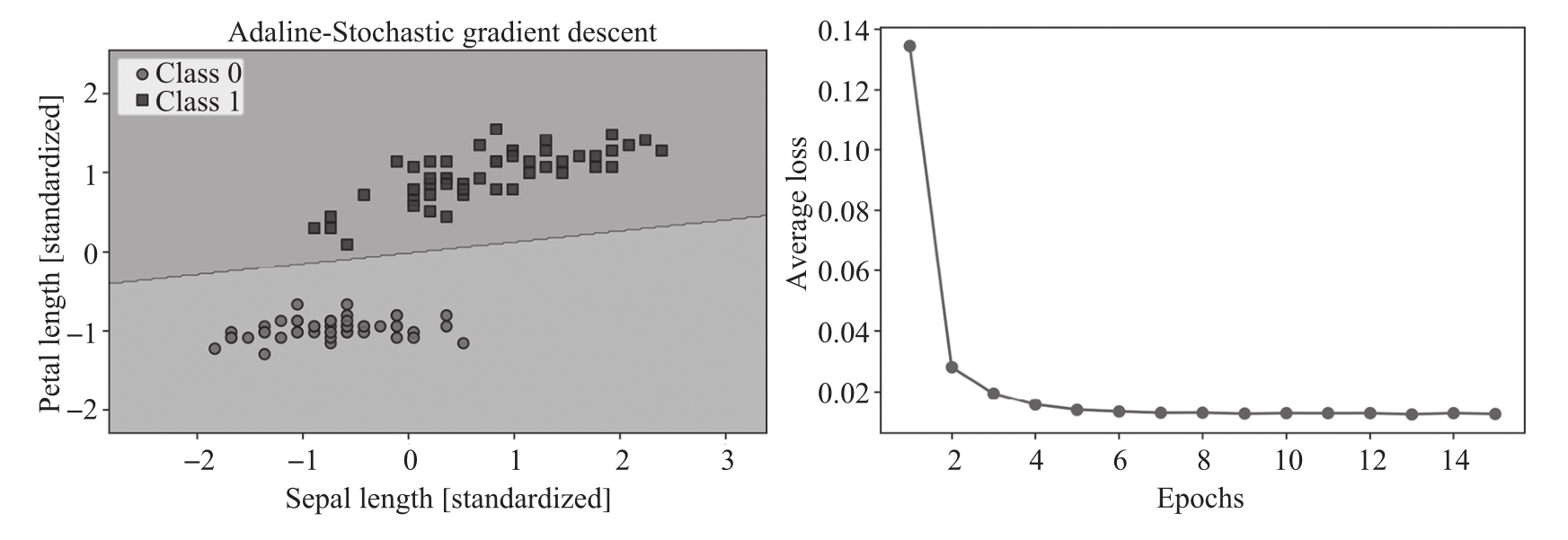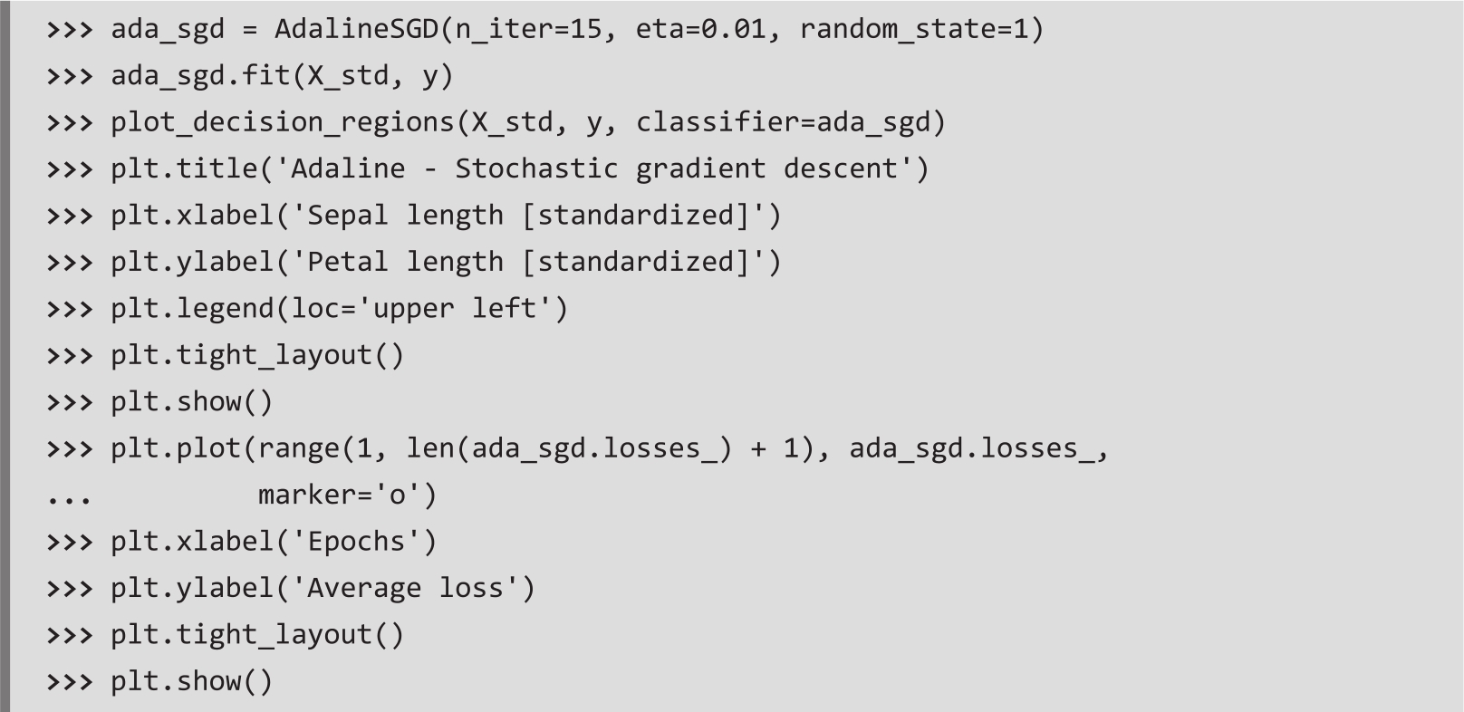 如图2.15所示,平均损失函数值下降得非常快,在15次epoch后的最终决策边界看起来与批梯度下降Adaline的结果类似。如果想更新模型,例如,实现使用流式数据的在线学习,可以在单个训练样本上调用partial_fit方法,例如ada_sgd.partial_fit(X_std[0,:],y[0])。
