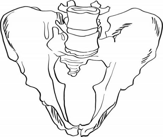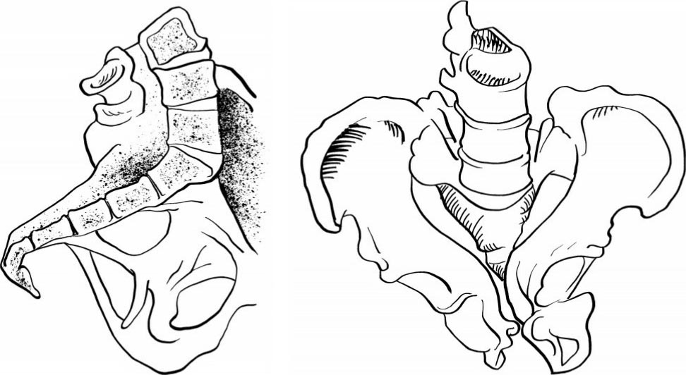 因骶岬向前下方突出使骨盆入口平面呈肾形,前后径明显缩短。坐骨结节外翻,使耻骨弓角度增大,骨盆出口横径增加。骶骨一般呈直型,尾骨呈钩状向前突(图2.35)。
