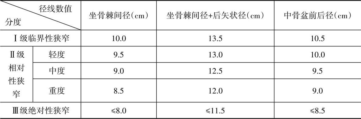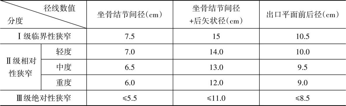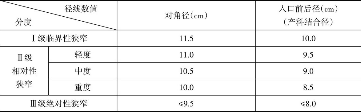 因入口平面前后径狭窄多于横径,故按入口平面前后径长短将骨盆入口平面狭窄分为3级(表2.6)。