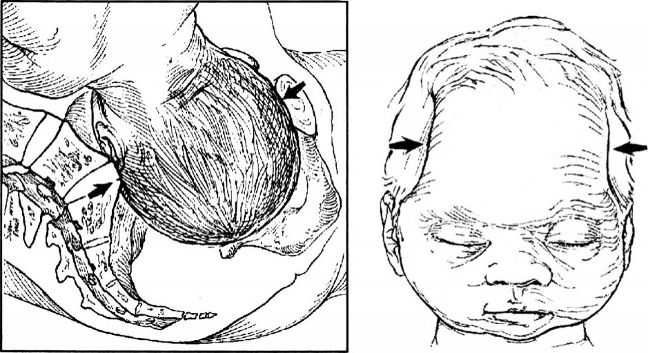 凌教授认为:仅入口一个面狭窄可给予充分试产的机会。先露部一旦通过入口即有可能顺利分娩;即使胎头入盆受阻无法衔接,也能及早发现、及时做剖宫产。但若延误诊断,会引起母儿一系列的并发症,即使胎头勉强通过入口平面,也有胎头损伤的可能(图2.32)。入口前后径绝对狭窄者(对角径≤9.5 cm,真结合径≤8.0 cm),应行剖宫产。