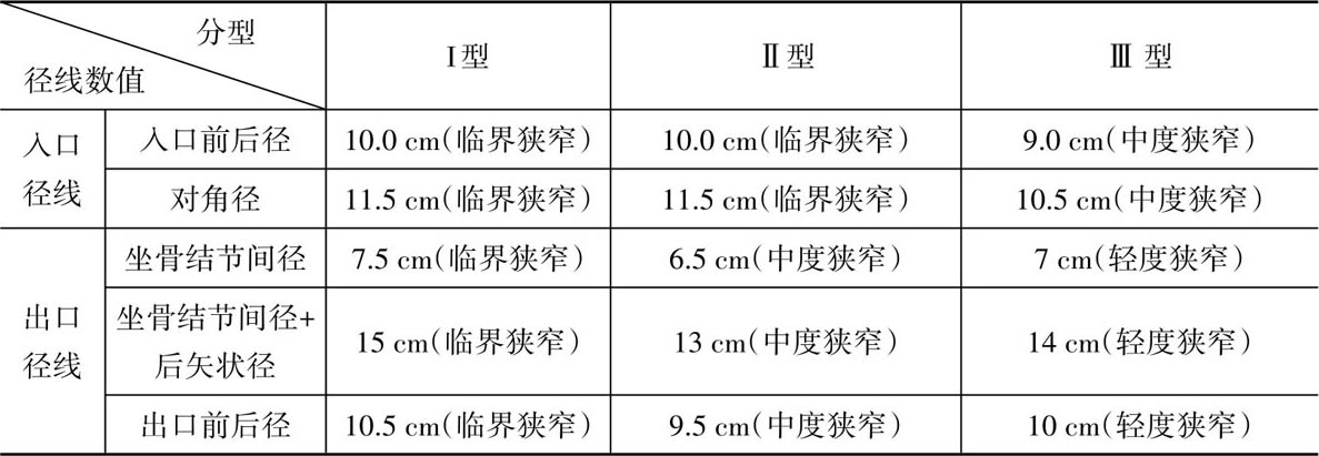 入口及出口平面均狭窄为均小型狭窄,占总数的27.89%。凌教授根据入口和出口平面狭窄程度的不同,把均小型狭窄骨盆分为三个亚型(表2.5):Ⅰ型,入口平面狭窄程度与出口平面狭窄程度相同;Ⅱ型,出口平面狭窄程度较入口平面狭窄程度更严重;Ⅲ型,入口平面狭窄程度较出口平面狭窄程度更严重。Ⅰ型及Ⅱ型较多见,分别占均小型狭窄骨盆总数的41.46%和41.47%;Ⅲ型少见,占17.07%。