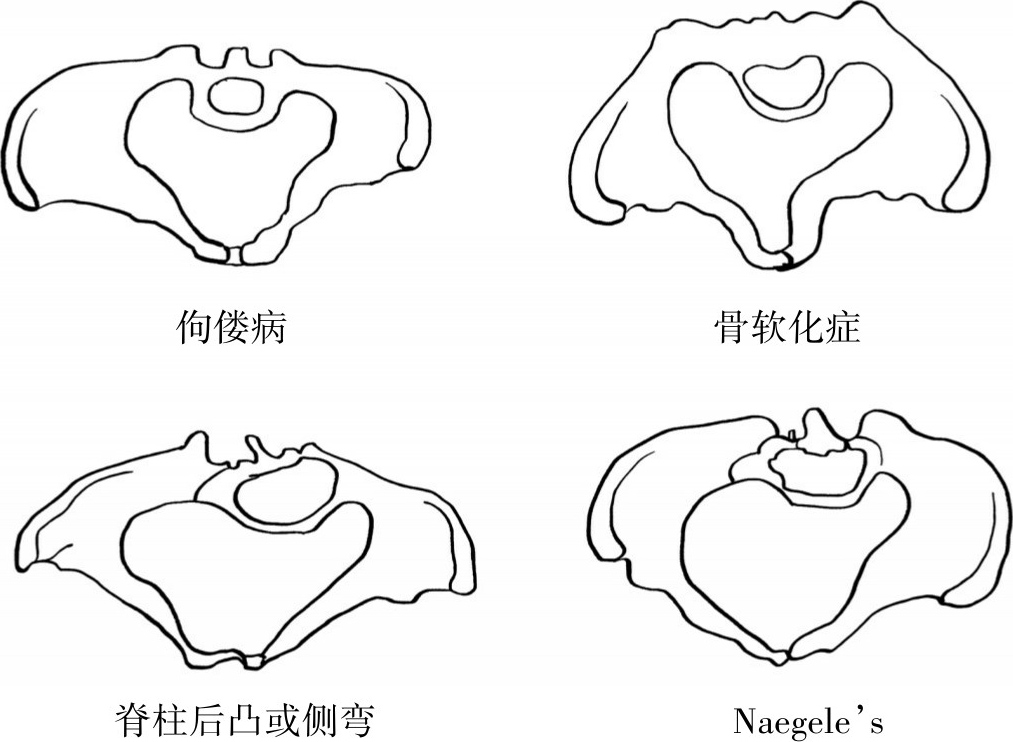 以上各种病理性及畸形骨盆的各个平面均可发生严重狭窄而影响正常分娩(图2.40),除骨盆仅轻度变形可短期试产外,一般均以剖宫产结束分娩。
