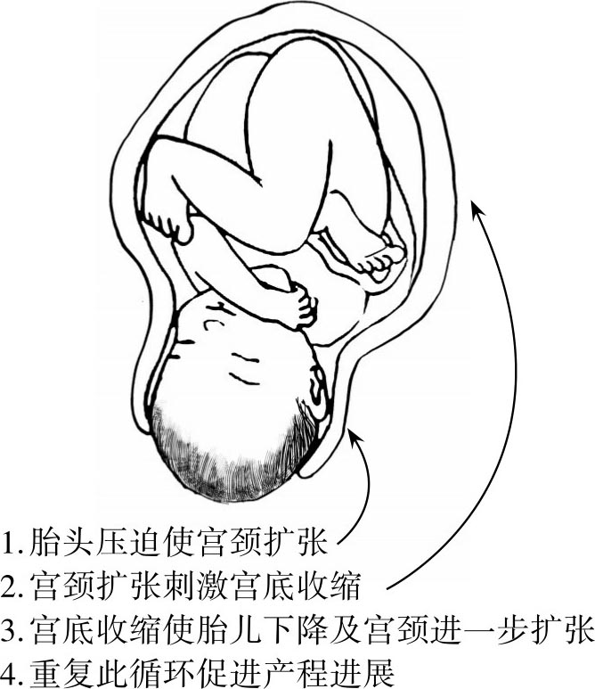 分娩发动中子宫收缩力的启动是多因素综合作用的结果,包括4个主要方面。①炎症反应机制:分娩前子宫蜕膜、宫颈均出现明显的中性粒细胞和巨噬细胞趋化和浸润,炎症细胞因子表达增加,提示非感染性炎症参与分娩启动。②激素调控:雌激素以及雌激素/孕激素比值升高,可以增加前列腺素生成、调节肌细胞缝隙连接增加、增加缩宫素受体数量从而促进子宫收缩。③神经介质调控:子宫主要受自主神经支配,交感神经兴奋子宫肌层α肾上腺素能受体,促使子宫收缩。乙酰胆碱通过增加子宫肌细胞膜对钠离子的通透性增加子宫收缩。④机械性刺激的正反馈理论(图4.4):临产时,胎头压迫宫颈使其伸展可导致子宫平滑肌收缩,有效的子宫收缩会驱使胎头向下而使子宫颈更加伸展,同时宫颈伸展还可刺激垂体分泌缩宫素,加强宫缩。
