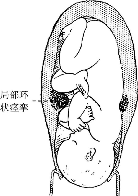 痉挛性狭窄环可出现在子宫内的任何平面,不随宫缩上升,通常位于围绕胎体比较小的部位、子宫上下段交界处、宫颈内外口处。痉挛性狭窄环很少能从腹部直接触到。