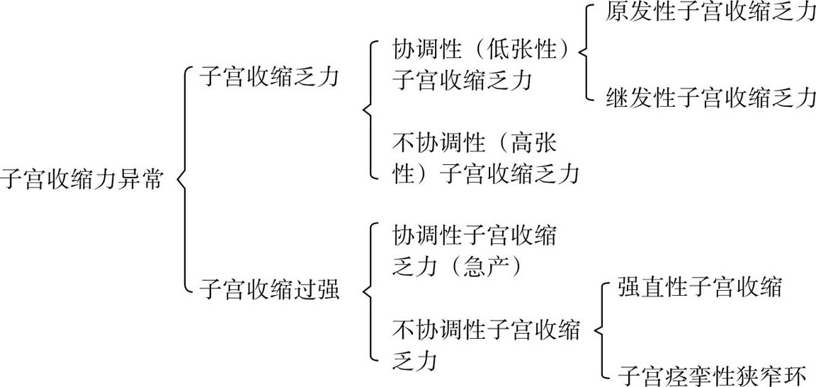 国内多根据子宫收缩强度及协调性对子宫收缩力异常进行分类(图4.5)。子宫收缩力异常分为宫缩乏力和宫缩过强,每类又分为协调性和不协调性子宫收缩异常。在临床中以协调性子宫收缩乏力更为常见。
