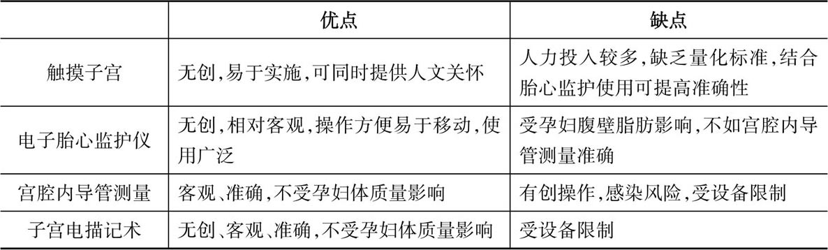 ④缩宫素使用过程中宫缩的监测:触摸子宫;电子胎心监护仪;宫腔内导管测量;子宫电描记术。触摸子宫的方法受主观因素影响较大,宫缩开始与结束时间不准确,子宫收缩强度缺乏客观判断标准,但仍然是目前常用的监测宫缩的方法。电子胎心监护仪记录子宫收缩频率和持续时间相对客观,但因受到孕妇体质量影响,子宫收缩压力并不准确。宫腔内导管测量宫腔压力为有创操作,需要在宫口开张2 cm以上且胎膜破裂情况下实施,目前认为这是监测子宫活动最准确的方法,但在我国未使用。子宫电描记术具有无创且不受孕妇体质量影响的优点,近年来国外研究较多,其具有较高的可靠性和临床应用价值,但敏感性过高,其记录到的子宫活动明显多于宫腔内导管测量的子宫活动。不同宫缩监测方法比较见表4.2。