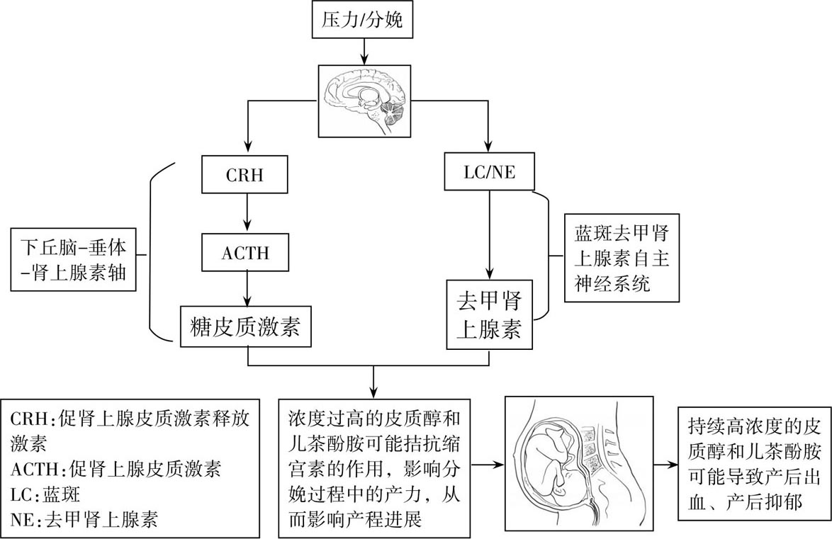 第一,产程延长:孕产妇的焦虑和恐惧,甚至环境因素都可能影响大脑不同区域的活动,可能通过激活交感神经系统,从而导致儿茶酚胺和皮质醇水平过度升高。而过高水平的儿茶酚胺和皮质醇有中和缩宫素和内啡肽的作用(图5.2)。在第一产程中,循环中过高水平的儿茶酚胺和皮质醇可能减少子宫、胎盘的血供,抑制缩宫素作用而影响产力,从而延长第一产程。