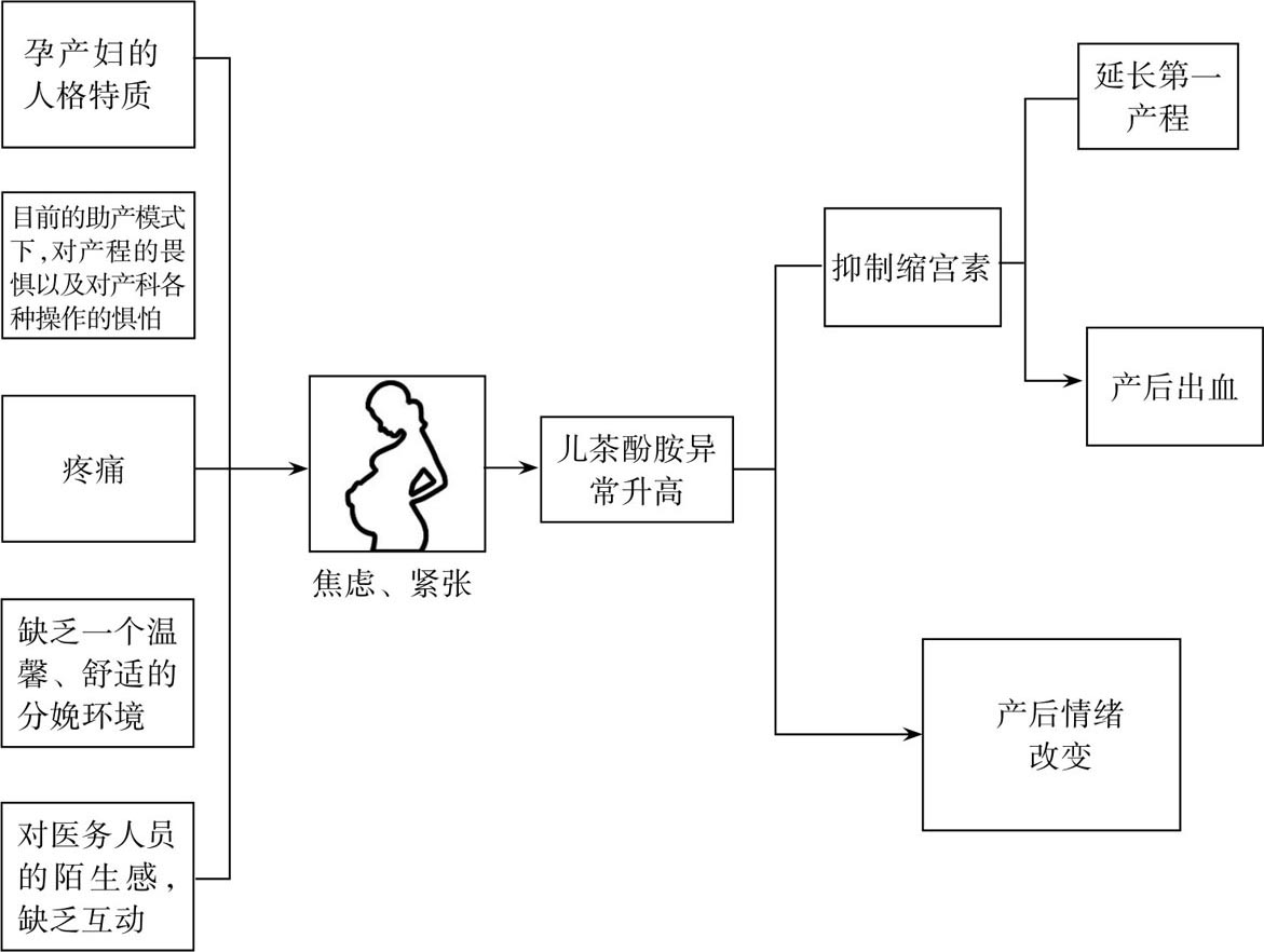 孕产妇精神紧张相关因素有:孕产妇本身的人格特质;孕产妇对多种产科操作、手术、产程未知的恐惧;疼痛;孕产妇对医护人员不熟悉、双方缺乏互动;缺乏一个温馨、舒适的分娩环境(见图5.1)。
