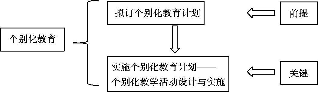 个别化教育主要包含两个板块的内容,第一个板块是拟订个别化教育计划,第二个板块是实施个别化教育计划,也称为个别化教学活动设计与实施。拟订个别化教育计划作为第一步骤,主要是全面了解个案现状,把握个案现有能力。个别化教学活动设计与实施主要是指将个案的个别化教育计划融入班级教学活动的设计与实施中,确保个别化教育计划中的长短期目标能够达成。