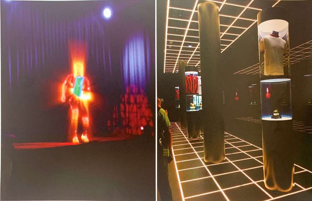 通过光的作用,在视觉形态上给予人一种动与静、光与暗的形态语言。展示空间的照明形态主要是人工照明方式,自然光照只能作为辅助光源,因而照明的形态直接影响人对物体的视觉效果。光与形态的结合也就形成了多维的图形空间,使图形的视觉传达更显丰富的内涵。在展示空间设计里,形成了视觉的多重效果与空间效果。展示中应用的电脑视频技术是将视频图像与场景模型等结合起来,产生丰富的视觉效果。一种被称为“幻想成像”的新技术就是利用数码图像技术中的“抠像”技术处理影视录像,并将特定的图像通过光学系统与模型或场景重叠起来,使观众可以在观看场景的同时,观看到特定的视频图像,造成奇特的效果。展示空间中光影成像的图形化,把时间与空间、形态与图像的概念边缘化,使展示的图形空间体验进入了一种新的境界,如图 3.4 所示。