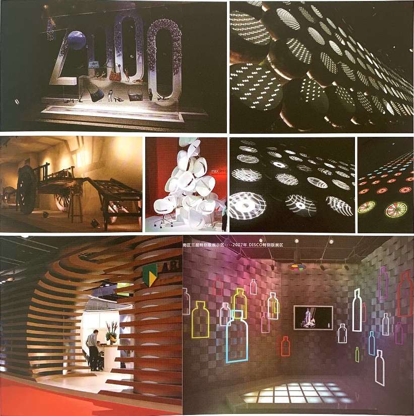 在展示空间叙述中,平面视觉的概念已经逐渐拓展,并产生了质的变化,从“二维”到“多维”既是一个维度,也是一种层次。在传统的展示空间中,二维的平面视觉主导着空间的表现,巧妙地运用形式美法则达到点、线、面的平衡,以寻求美好的视觉效果。印刷术也被大量广泛地使用在空间的各个角落,其内容就是利用文字、图形等元素在平面视觉中进行合理的编排。因此,人们常常理解平面设计就是以制作展板为主要功能的设计范畴。然而,在现代展示空间设计的概念中,这种简单的平面编排已经被完全颠覆,设计师已经不能只局限于二维领域的对于形式美感的布置,而是要把有较好美感的视觉元素放置在三维的空间领域进行空间编排,利用空间中的基础形态,如天花板、地面、柱、墙、屏风、隔断等,进行如层叠、反复、交错、镂空等手法的表现,并利用新媒体达到更深入更神奇的视觉效果,如魔术般,视觉可以变得可疑,甚至产生幻象,就如同早期的绘画艺术,人们渴望在二维平面空间中表达三维的透视效果一样,如图 3.5 所示。