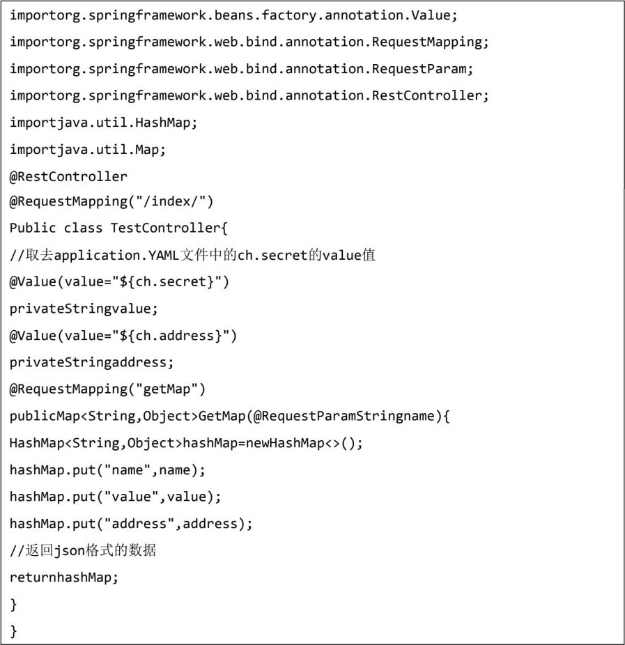 在工程【boot_configure】并在的源文件目录src/main/java/com/boot/configu re/bot_configure/controller在创建TestController类编写获值数据。
