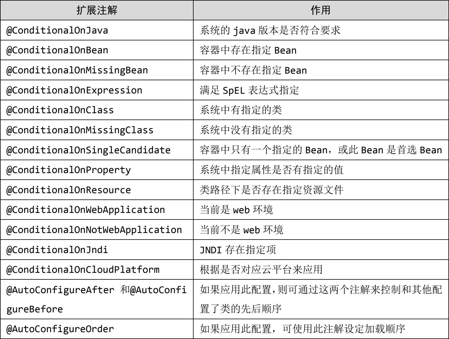 必须是@Conditional指定的条件成立,才能给容器中添加组件,配置里面的所有内容才生效,常见的@Conditional配置表,见3.1表。