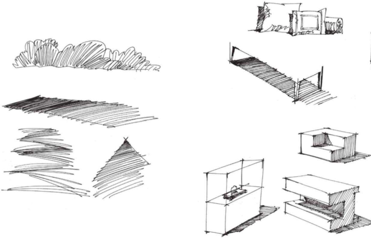 线条是一切造型艺术的基础,在绘图过程中常给我们带来感观上的快乐,像音乐中的音符,同时表达了绘画者的思想情感和视觉语言,拉近人们之间的沟通距离。线条是变化的,由线可以组成面,可以组成立体空间,所以一个画面里离不开线条的构成。线条是构成主要视觉艺术的元素之一,它是一切活动的标志,同时也是一种对美认知的态度。其美感主要来自对自然、对生活中千变万化的物体简练的概括和提炼,通过绘画者对物体对象的观察与理解,呈现出不同的姿态,寻找其中的规律,体现出线条的美感。所以这也就解释了作为初学者为什么要练习线条了,无论是徒手练习还是尺规制图,线条始终是室内软装陈设设计表现的根本,如图1.2所示。