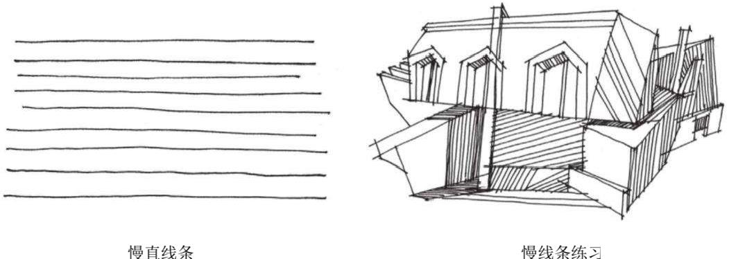 (4)慢直线条(抖线):在徒手表现时,线分为快线、慢线。这里说的慢线也是直线条,特征是小曲大直,如图1.7所示。