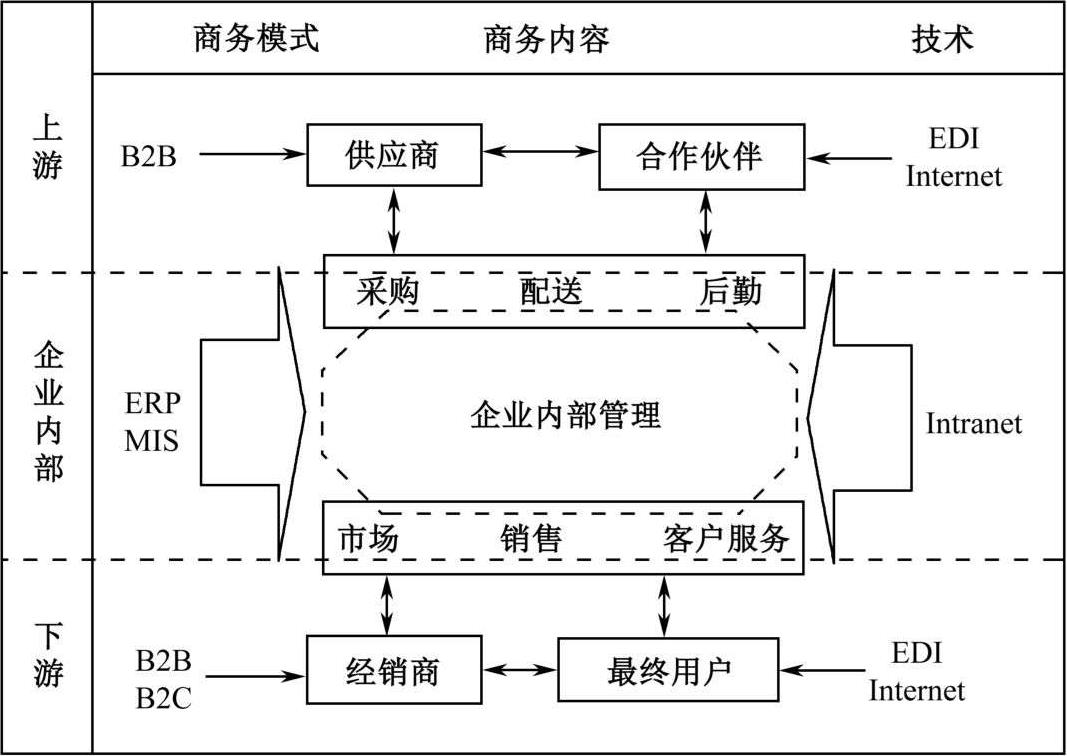 然而,在电子商务的实际应用过程中,由于各企业的性质和规模存在一定的差异,因此电子商务实现的要求各不相同。例如,有的企业是面向消费者的,有的电子商务服务是面向供应商或销售商的,甚至两者兼而有之;在商务活动上又有电子采购和在线客户服务等。下面以企业为例介绍电子商务的应用结构,为电子商务模式分析提供一个整体框架,如图 2.2 所示。