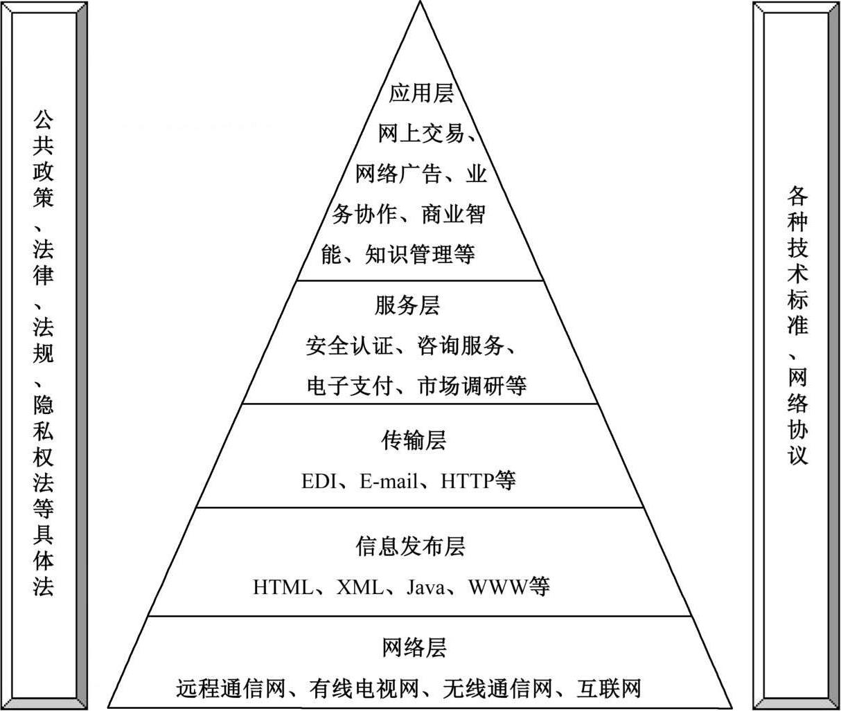 网络层指网络基础设施,是实现电子商务的基础设施,它是信息的传输系统,也是实现电子商务的基本保证。它包括远程通信网、有线电视网、无线通信网和互联网。因为电子商务的主要业务是基于Internet的,所以互联网是网络基础设施中最重要的部分。