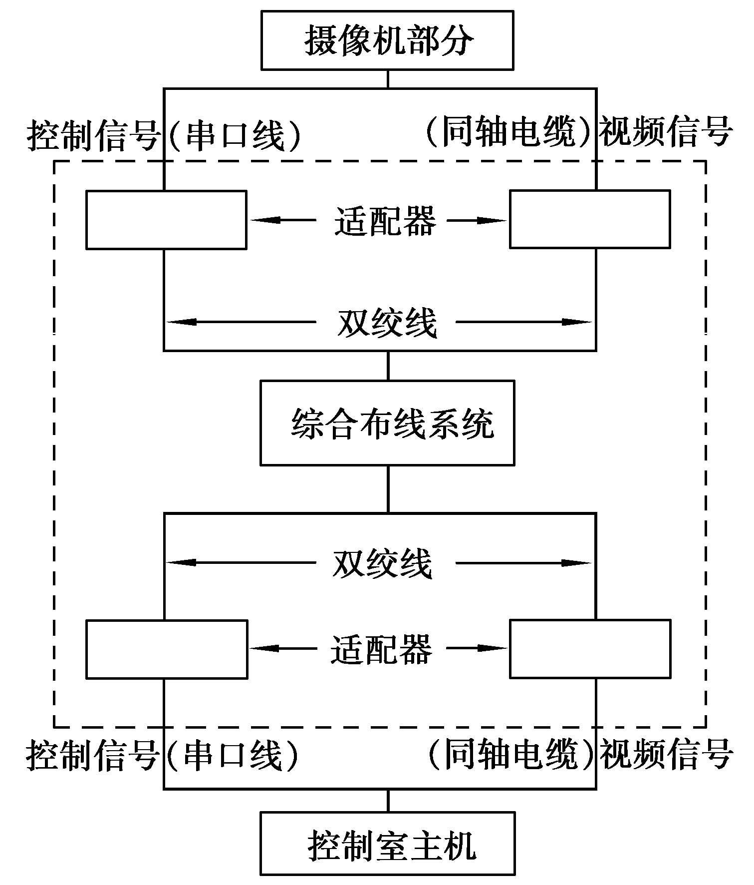 电视监控系统中所有现场的彩色(或黑白)摄像机(附带遥控云台及变焦镜头的解码器),除采用传统的同轴屏蔽视频电缆(75Ω)和屏蔽控制信号电缆与控制室控制切换设备连接构成电视监控系统的方法外,还可采用综合布线系统中非屏蔽双绞线缆(100Ω)为链路,以及采用视频信号、控制信号(如RS 232标准)适配器与监视部分、控制室部分的电子监控设备相匹配相连后,构成各摄像机及解码器与监控室控制切换设备之间采用综合布线系统进行通信的监控电视系统的方法,如图2.23所示。