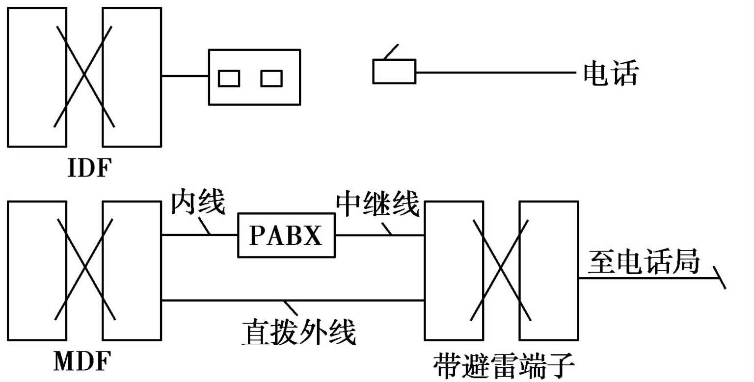 数字用户交换机(PABX)与综合布线系统之间的连接是由当地电话局中继线引入建筑物的,经系统配线架(交接配线架)外侧上的过流过压保护装置后,跳接至内侧配线架与用户交换机(PABX)设备连接。用户交换机与分机电话之间的连接是由系统配线架上经几次交叉连接(跳接)后形成的。