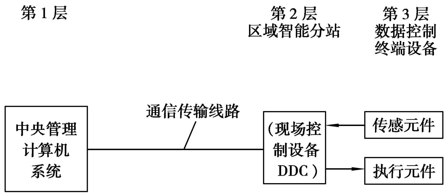 当前,BAS常采用分层分布式结构。整个集散型控制系统分为3层,每层之间均有通信传输线路(又称传输信号线路)相互连接形成整体。因此,集散型控制系统结构由第1层中央管理计算机系统、第2层区域智能分站(现场控制设备,即DDC控制器)和第3层数据控制终端设备或元件组成,如图2.20所示。