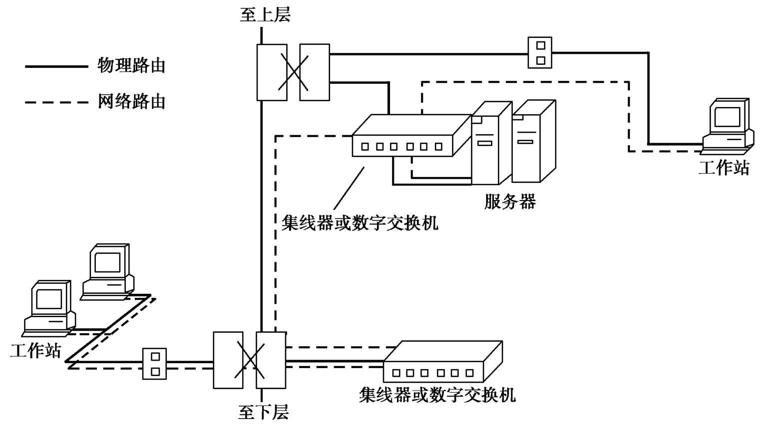 当利用综合布线系统作为传输信号线路时,GCS通过装配有RJ-45插头的适配器与建筑环境控制和监测设备的网络接口或直接数字控制器(DDC)设备相连。经过综合布线系统的双绞线和配线架上多次交叉连接(跳接)后,形成建筑设备自动化系统中的中央集中监控设备与(分散式)直接数字控制设备之间的链路。此时,(分散式)直接数字控制设备与各传感器之间也可利用综合布线系统中的线缆(屏蔽或非屏蔽)和RJ-45等器件构成连接链路。
