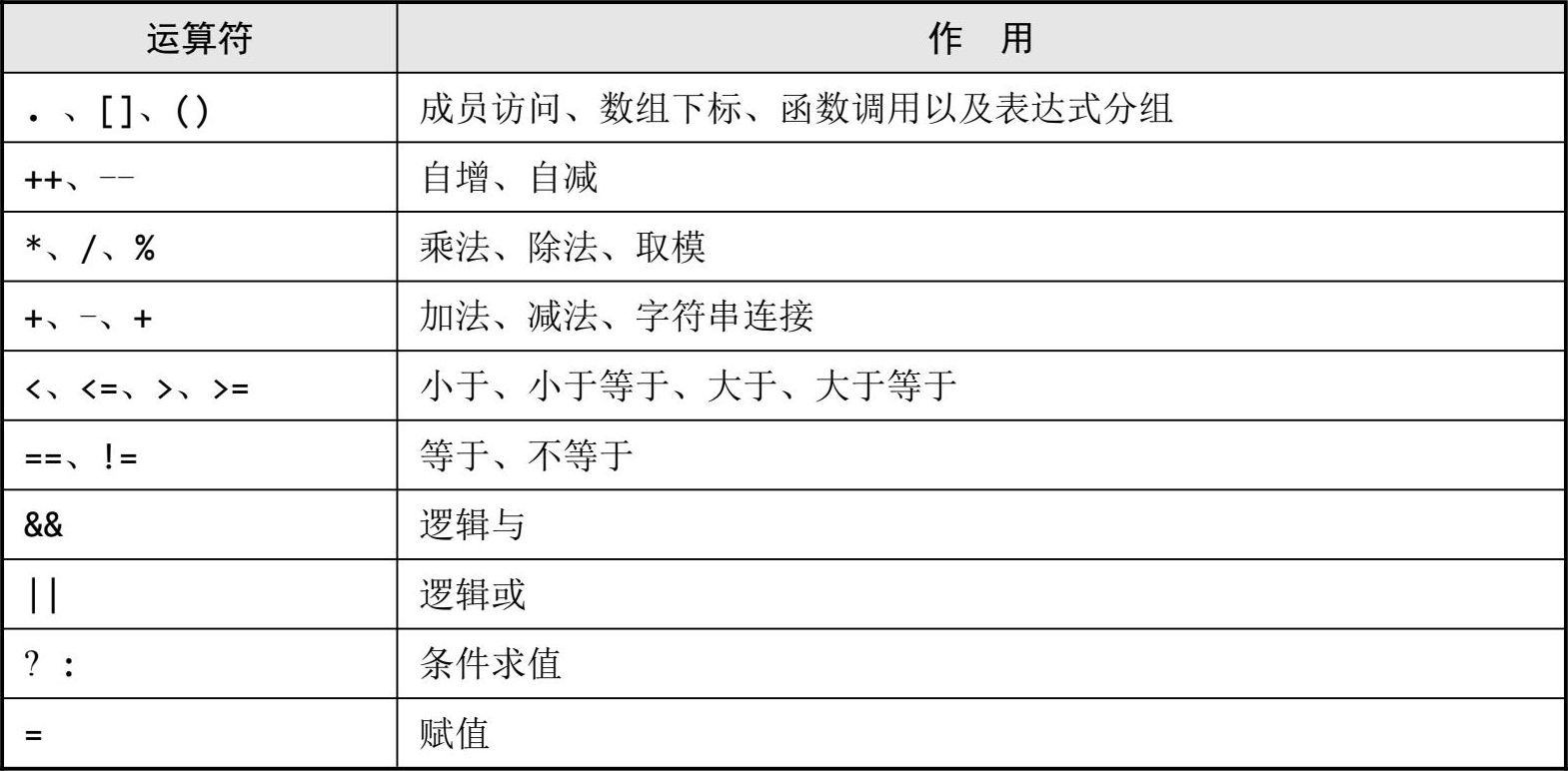 下面我们按从最高到最低的优先级列出JavaScript常用运算符,具有相同优先级的运算符按从左至右的顺序求值,见表 1.7。