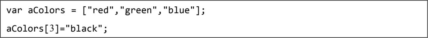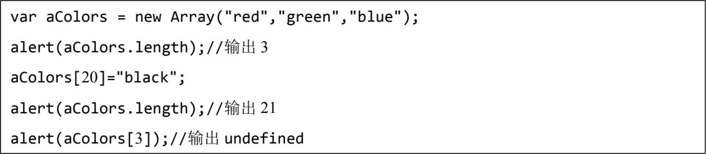 这段代码中第一行运行之后,数组共有 3 个元素,它们的索引位置分别是0,1,2,下一个未使用的位置是 3,所以将值black赋给位置 3,这样数组的长度变成了4。但假设把值black赋给位置20呢?此时,从位置3到位置19都会被自动地赋予值undefined,再在位置 20 赋值black,这样数组的长度变成 21。