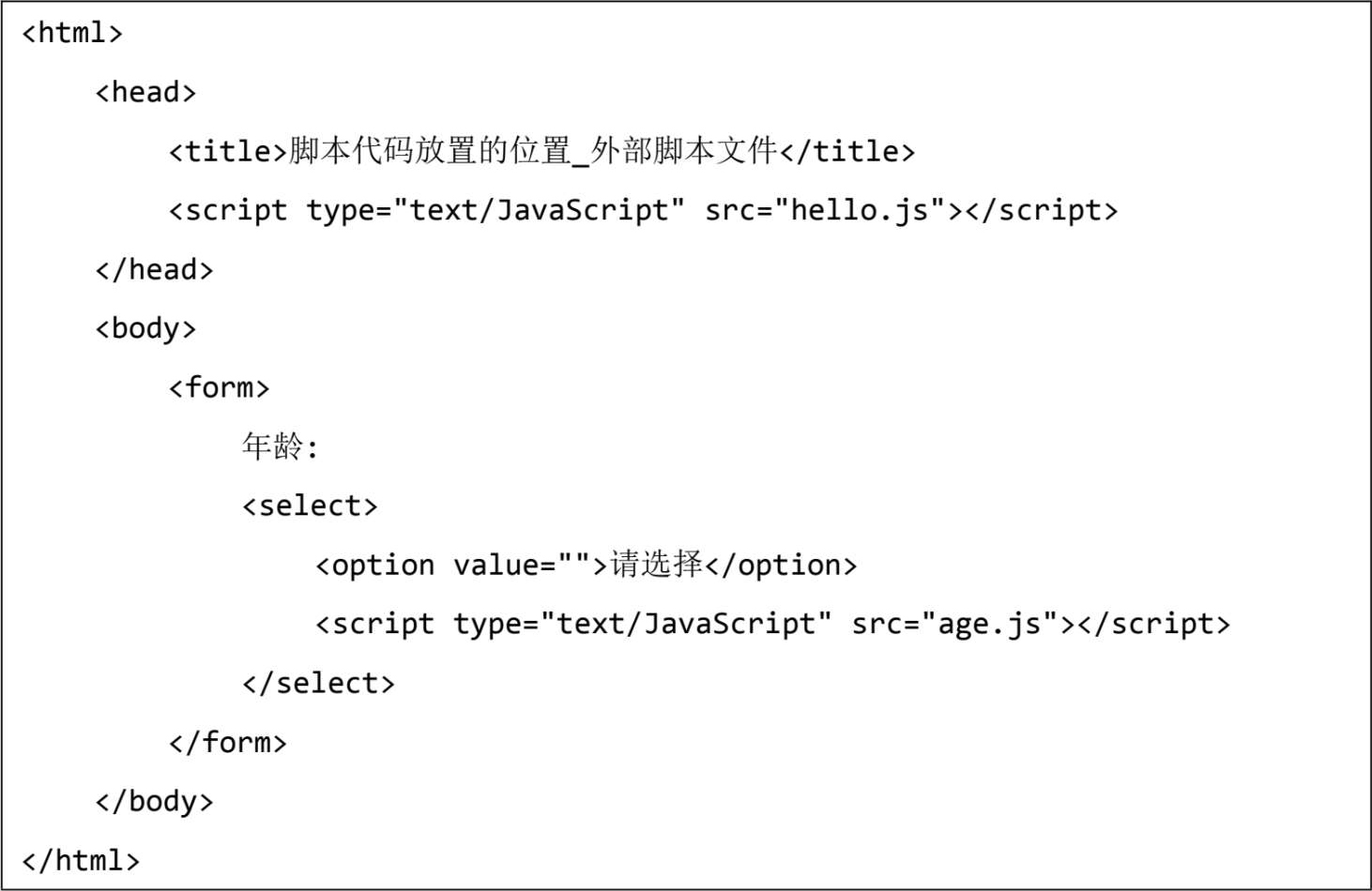 将脚本代码放置在独立的脚本文件中,可实现代码的跨页面重用。另外,引用外部脚本文件的<script></script>标签只能是空标签,不能在其中放置其他脚本代码。