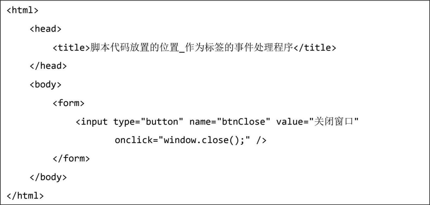 onclick属性是<input >标签的一个事件属性。当浏览者单击这个按钮时,<input>标签将引发此事件。而“window.close();”是一段脚本代码,这段代码将在onclick事件引发时自动执行,它执行的结果是浏览器窗口被关闭。我们把为事件所编写的脚本代码称为事件处理程序。