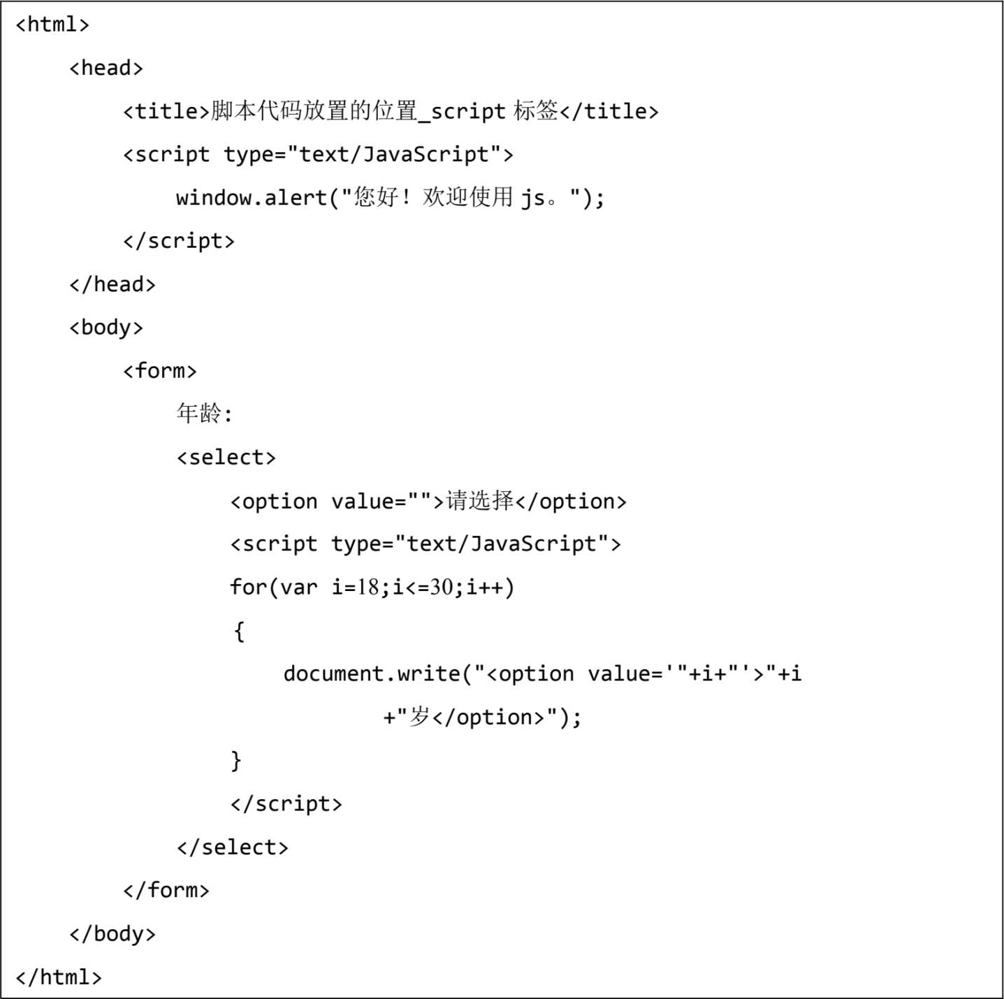 在页面的头部<head></head>或页面的正文<body></body>内都可以编写脚本代码。为了告知浏览器这些代码是JavaScript语言的代码而非HTML,需要将脚本代码放置在<script></script>标签中。