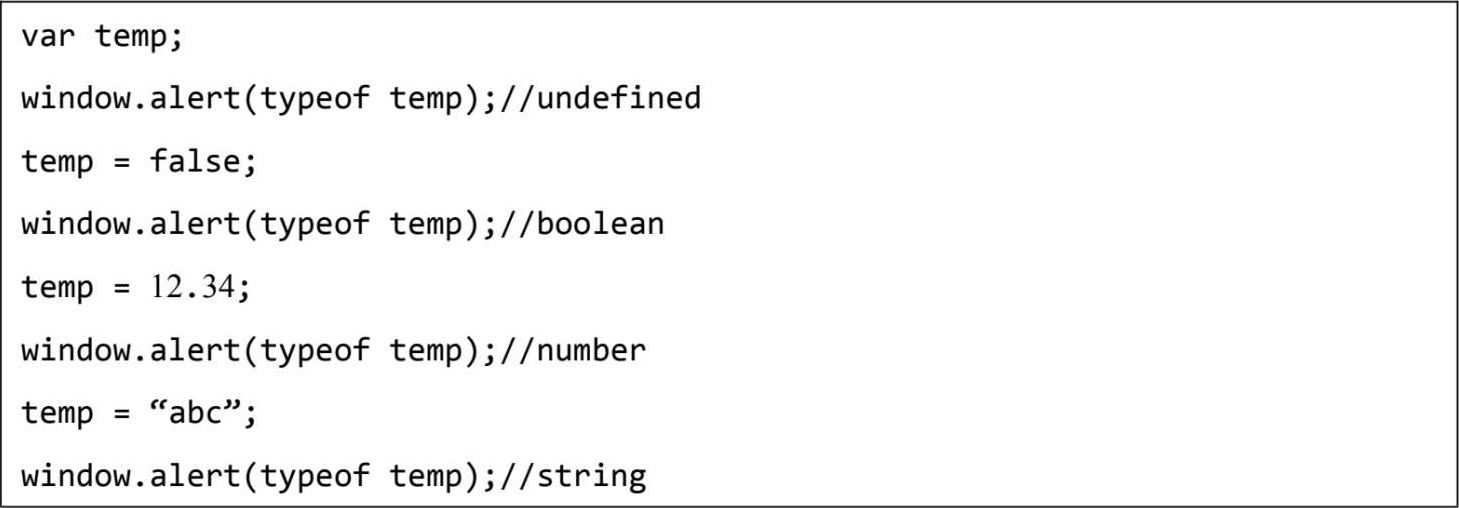使用typeof运算符可以获知一个变量或值的在当前时刻的数据类型。请看以下代码: